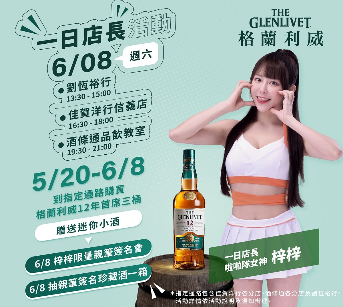 格蘭利威12年首席三桶,打造一日店長專賣店,針對目標客群媒合符合TA喜好的藝人同時也是知名啦啦隊員「梓梓」,發揮精準影響力,搭配宣傳規劃,從社群號召、活動宣傳、實體引流等,提升整體品牌好感度與實體通路銷量。